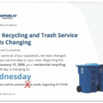 - Republic UpdateIn the past week, we learned that Wednesdays will be our new trash & recycling day beginning January 14th. Find… Read more: Republic Update