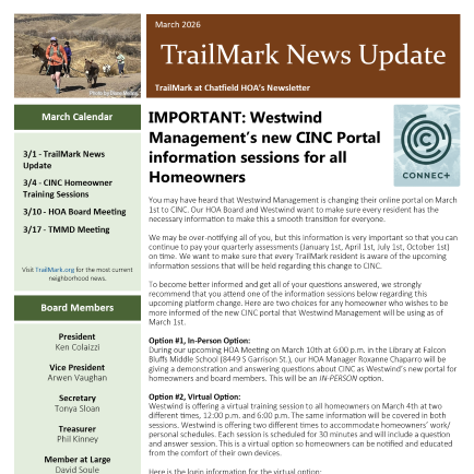 - IMPORTANT: Westwind Management’s new CINC Portal information sessions for all HomeownersDear TrailMark Residents, Many of you have heard that Westwind Management is changing their online portal on March 1st to CINC. Our… Read more: IMPORTANT: Westwind Management’s new CINC Portal information sessions for all Homeowners