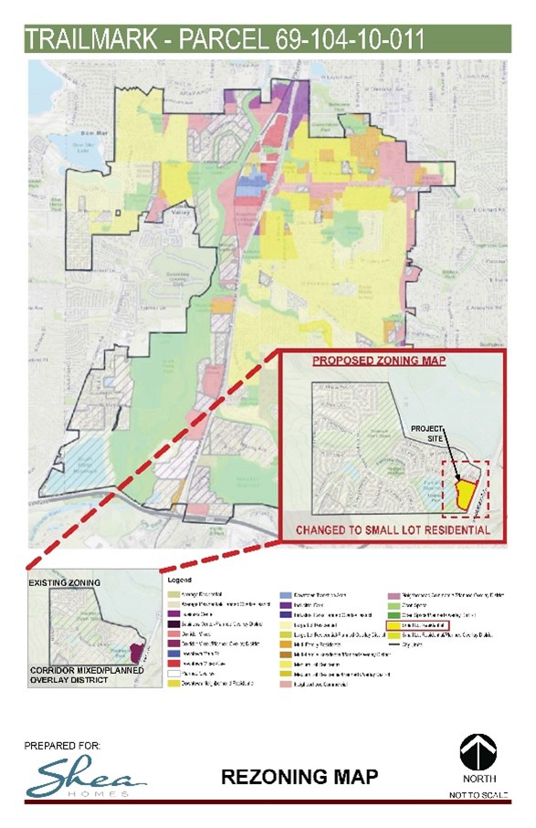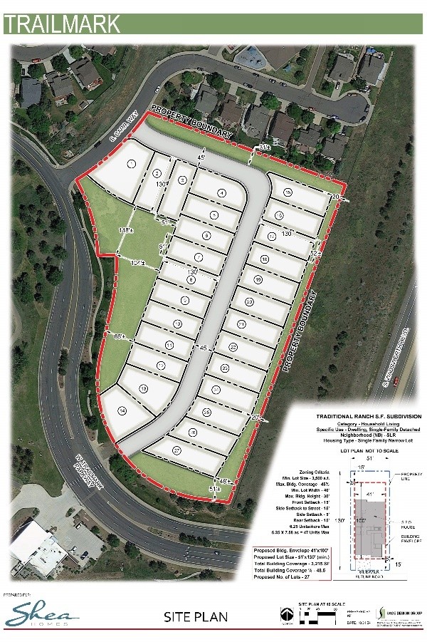 The City of Littleton, in coordination with Jefferson County, is reviewing a proposal from Shea Homes to develop the final vacant parcel in TrailMark, located at the northwest corner of West TrailMark Parkway and South Wadsworth Boulevard. The current proposal includes 27 single-family homes on land currently zoned for commercial use.
