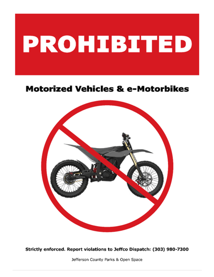 This is a friendly reminder from Jeffco Parks & Open Space (JCPOS) around the use of motorized vehicles on park properties and trails. We’ve seen an increase in e-motorbikes on the trails at Hildebrand, Deer Creek, and other parks in the system. These bikes are considered motorized and expressly prohibited on JCPOS property in our regulations: