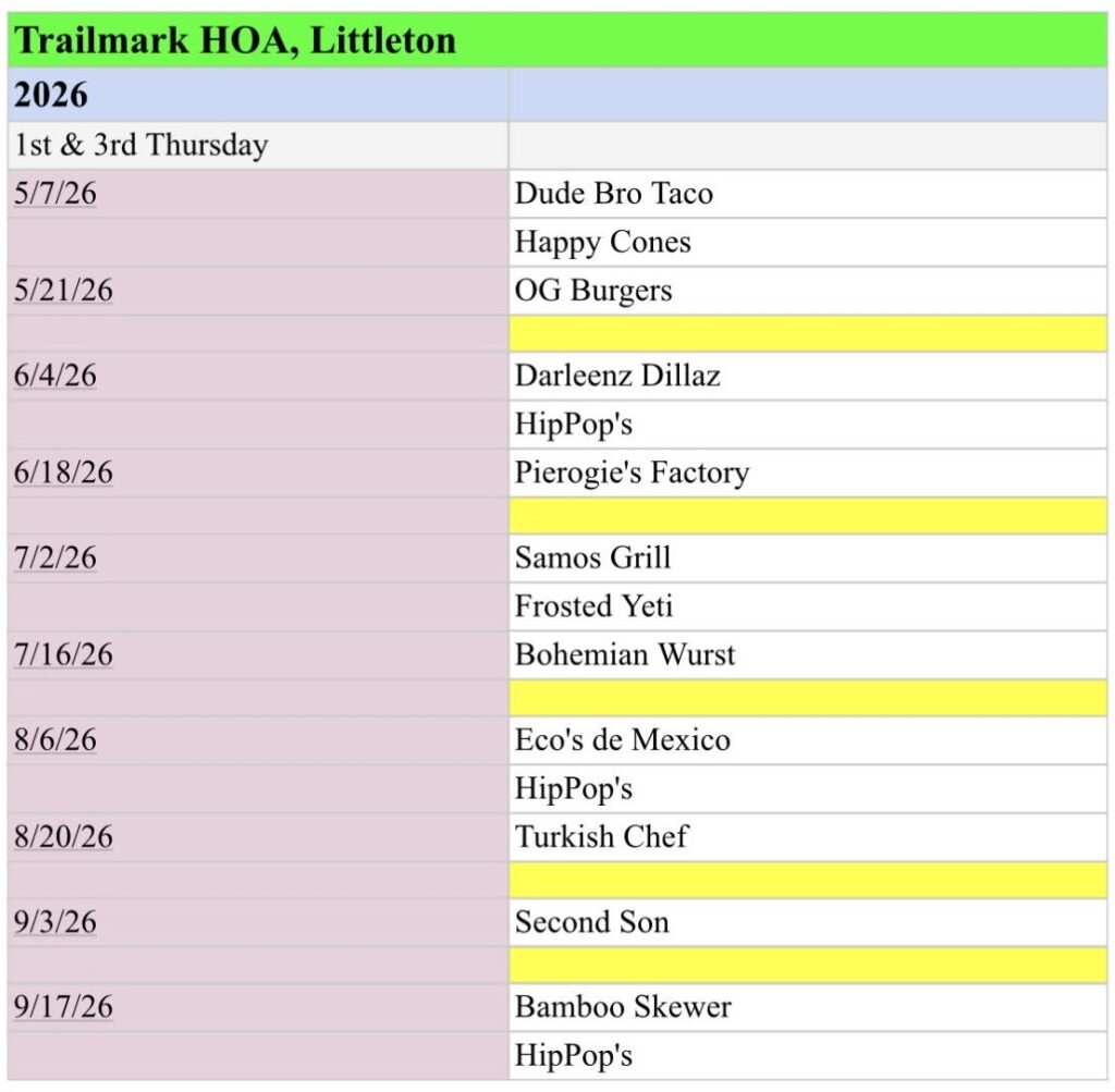 We are gearing up for a new Food Truck Thursday season beginning in May and running through mid-September. Here are the dates to add to your calendars and the trucks we have scheduled so far. The yellow lines represent the dessert trucks that still need to be booked for that night. The scheduling company we use is still working on it. Thanks friends – Excited for more community time at the playground on Food Truck Thursday nights!