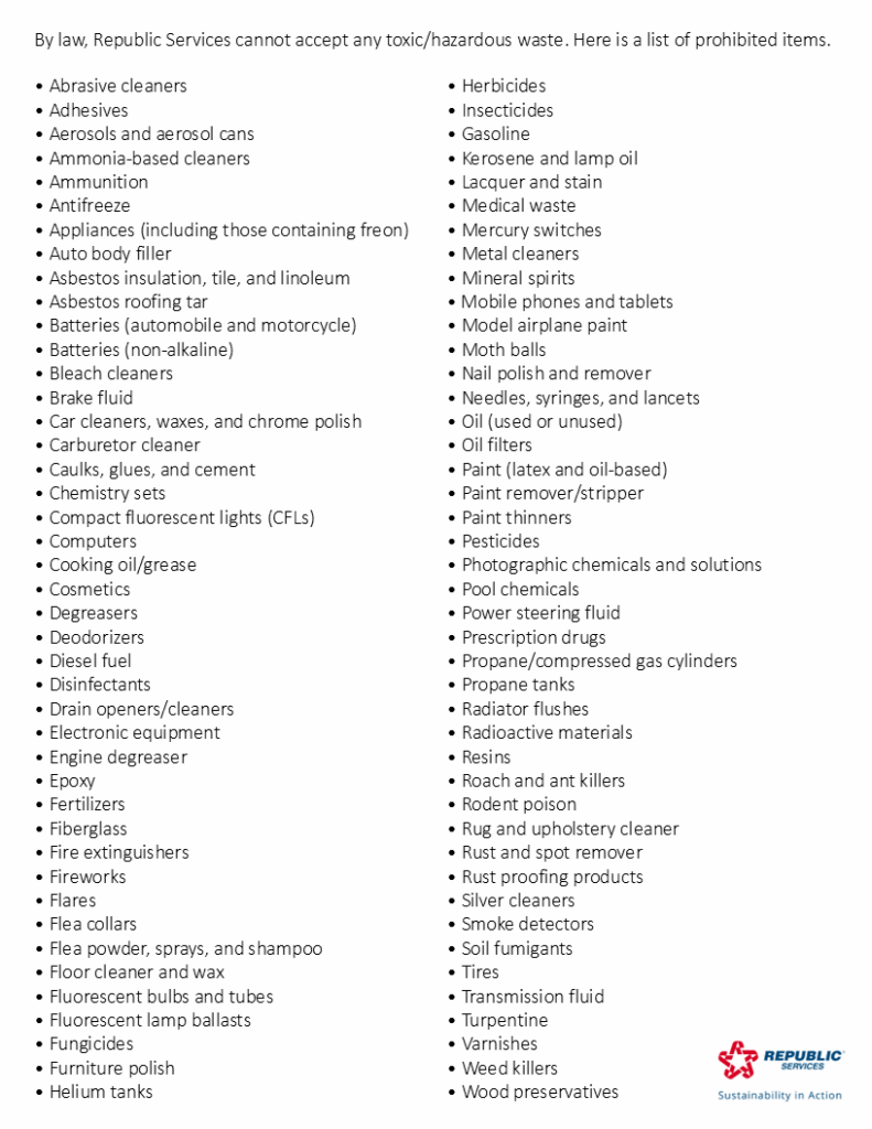 By law, Republic Services cannot accept any toxic/hazardous waste. Please review this list of items that will NOT be accepted by Republic Services.