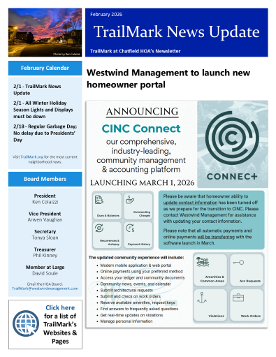 - Send communications to the HOA Board at TrailMark@westwindmanagement.com