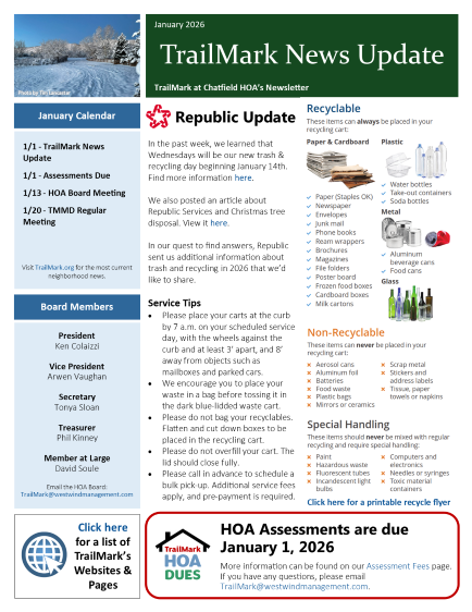 - Send communications to the HOA Board at TrailMark@westwindmanagement.com